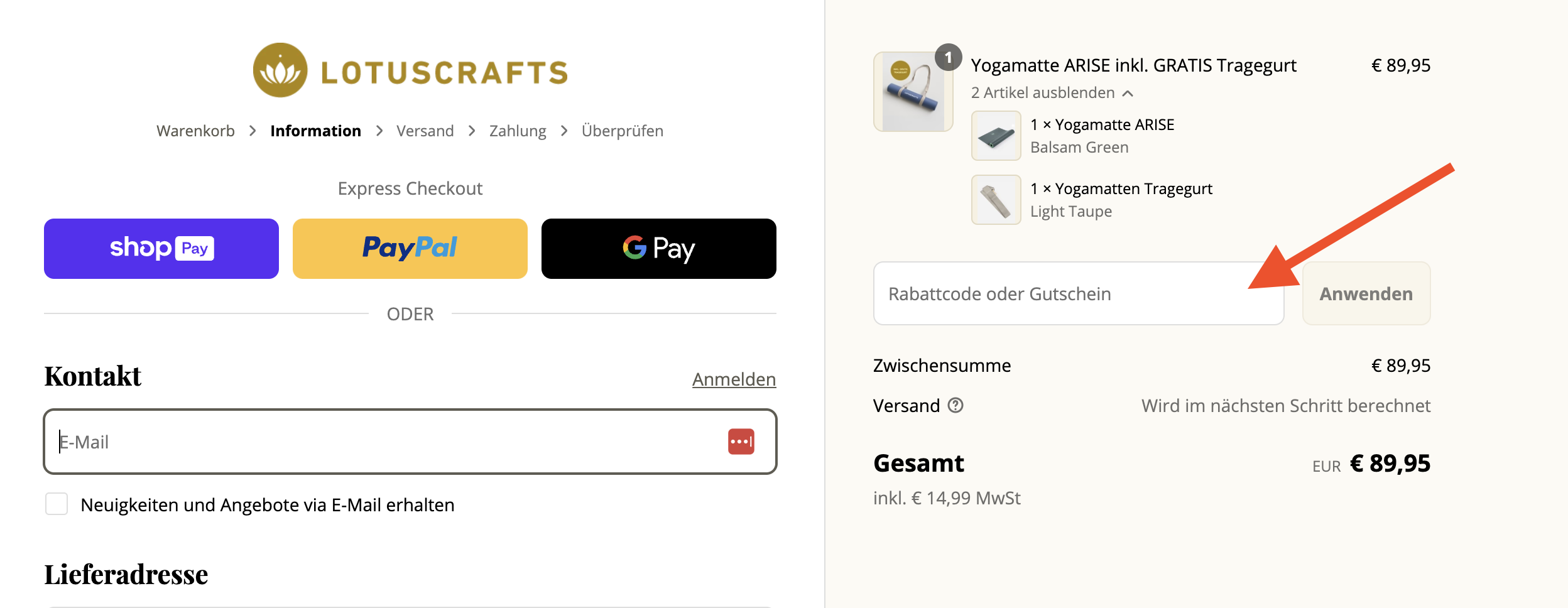 Am Ende deines Bestellprozesses kannst du im Feld 'Rabattcode' in der rechten Spalte deinen Rabatt einlösen. Bitte achte auf eine korrekte Groß- und Kleinschreibung.